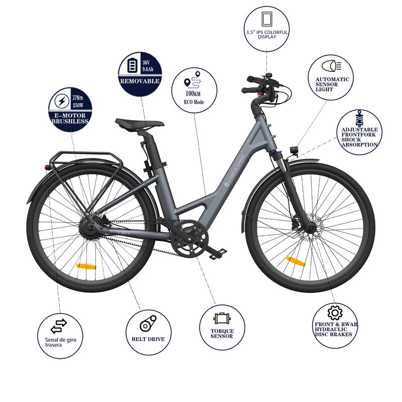 ADO Air28 Vélo électrique, 28″ Ebike, Entraînement par Courroie, APP, 250W, 36V
