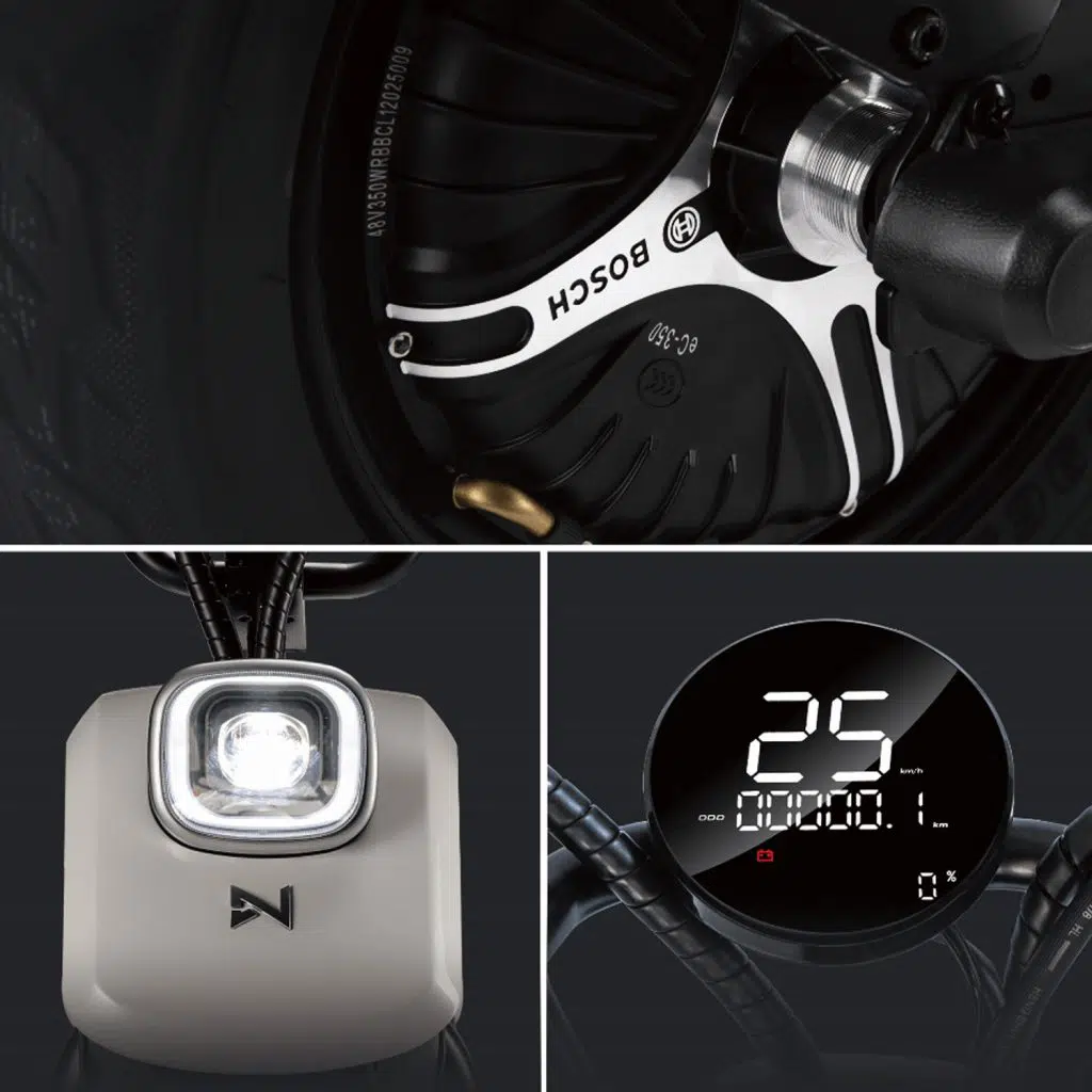 La motorisation du LVNENG Gener le cantonnera à un usage strictement urbain, et pour les zones 30. En effet, son moteur délivre 810 Watts, ou 0.81 kW. Sa vitesse maximale est de 25 km/h. De marque Bosch, il est intégré en roue arrière. Dénué de transmission, ce petit moteur ne demandera donc presque aucun entretien. Les accélérations sont très douces, sans aucun à-coups. À son guidon, la conduite est fluide, sans mauvaise surprise. On se sent en sécurité. Si vous avez à circuler dans une ville où de nombreuses côtes sont présentes, la capacité de franchissement du LVNENG Gener est de 9°, ou 15%.