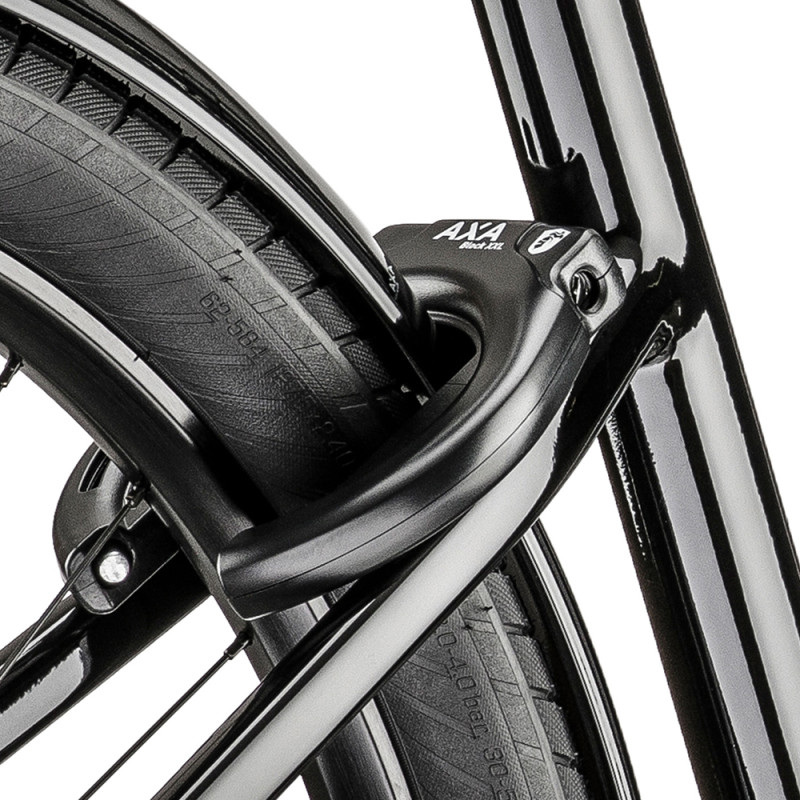 Lundi 27, aluminium 6061 T4-T6, tubes hydroformés et extrudés à triple cavité, intégration exclusive de la batterie, axe à serrage rapide 9×135 mm, avec antivol de cadre AXA Block XXL (clé identique à la batterie)