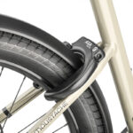 Le Mardi 27.4 en version chaîne avec la batterie de 500 Wh vous est confié déjà tout-équipé. Vous avez le kit Moustache habituel, qui comprend les fameux garde-boue tubulaires en aluminium, la béquille réglable à l’arrière et le porte-bagages, avec son rack MIK HD qui permet de clipser un siège enfant et ses fixations latérales Quick-Lock 3.1, qui sont prêtes à accueillir vos sacoches Ortlieb. Ajoutez encore les feux avant (AXA Nxt 30 lux) et arrière (Spanninga), sans oublier l’antivol de cadre Block XXL, qui peut recevoir une chaîne antivol.