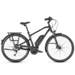Ce vélo Moustache se décline en deux versions, avec un cadre standard ou semi-ouvert. Le coloris est noir mat et les roues sont en 28 pouces. La batterie de 500 Wh reste apparente, en position sur le tube diagonal pour abaisser le centre de gravité. Les tubes en aluminium forment un cadre robuste et dynamique, aux lignes soignées. Vous allez peut-être découvrir avec bonheur la prise en main du fameux guidon Moustache. Il offre un appui naturel pour enchaîner les kilomètres sans douleurs. La selle ergonomique et la fourche télescopique améliorent l’expérience de conduite.