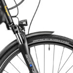 Les principaux composants sont de bonne facture, comme le dérailleur Shimano Altus qui compte 9 vitesses et fait équipe avec une cassette 11-36 dents. Vous bénéficiez du système de freinage Shimano MT200 avec des étriers à 2 pistons et des disques de 180/160 mm. Ces freins hydrauliques répondent efficacement mais sans brutalité, pour vous aider à garder le contrôle en cas d’urgence. Les pneus Schwalbe Impac Streetpac sont des spécialistes de l’asphalte, mais peuvent s’aventurer sans problème sur les chemins roulants.
